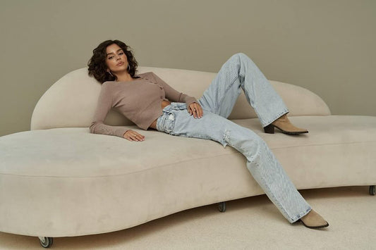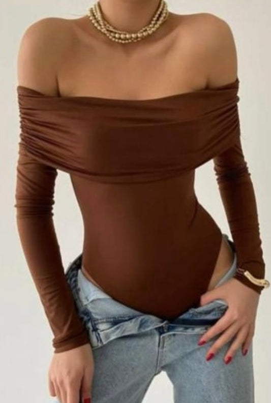 Rudos spalvos bodis nuleistais pečiais