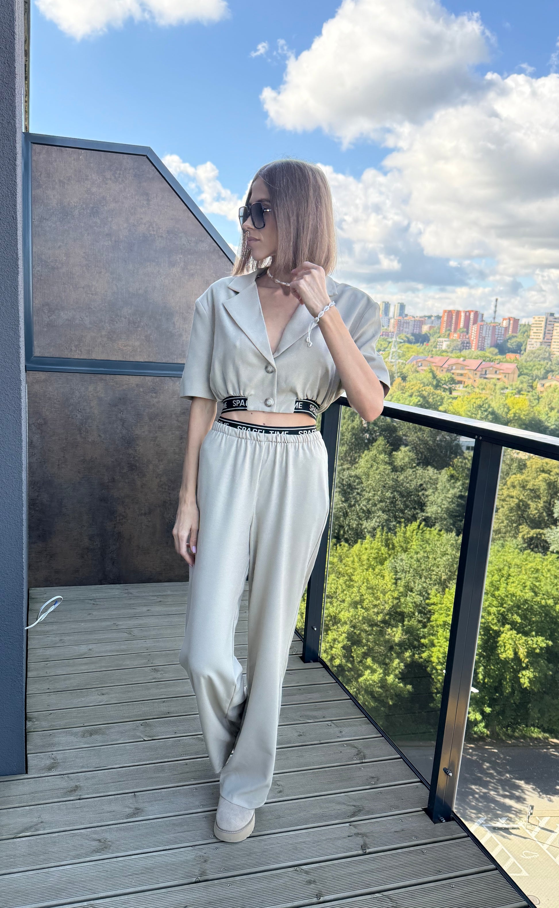 Dviejų dalių kostiumėlis: ilgos, laisvo kirpimo kelnės ir crop top'as.