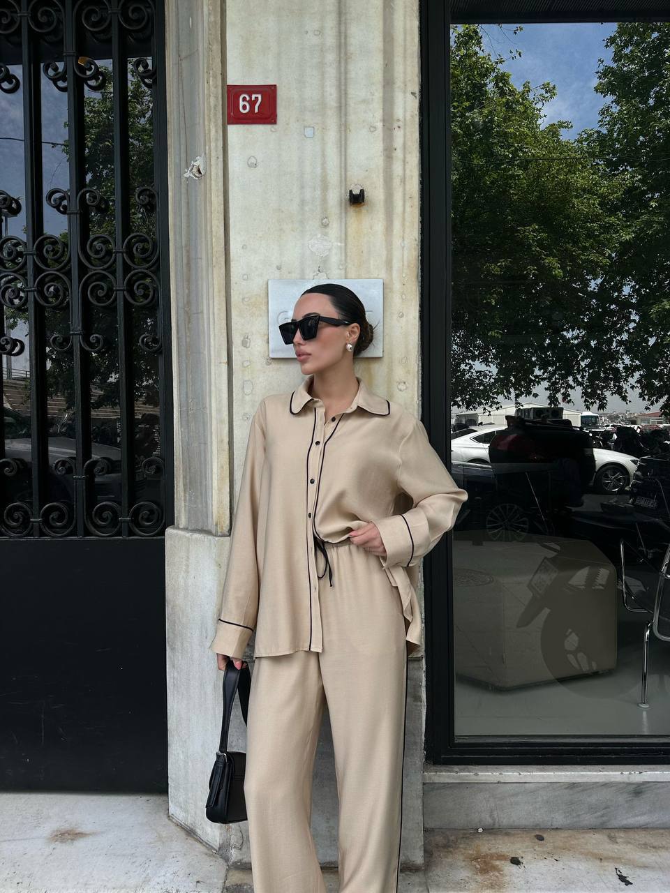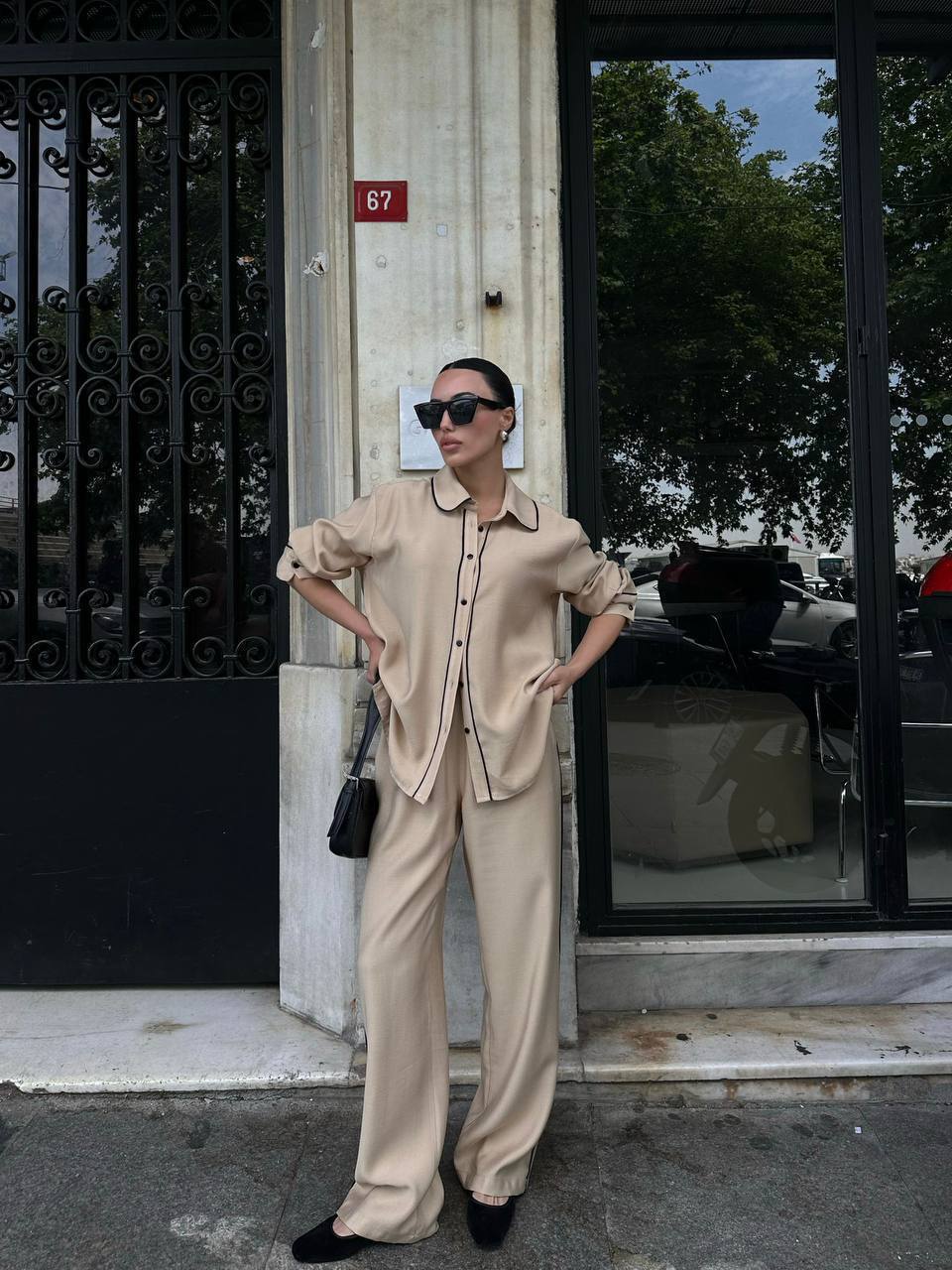 Kelnės ant gumos su raišteliais. Palaidinė su kalnieriumi ir sagutėmis.