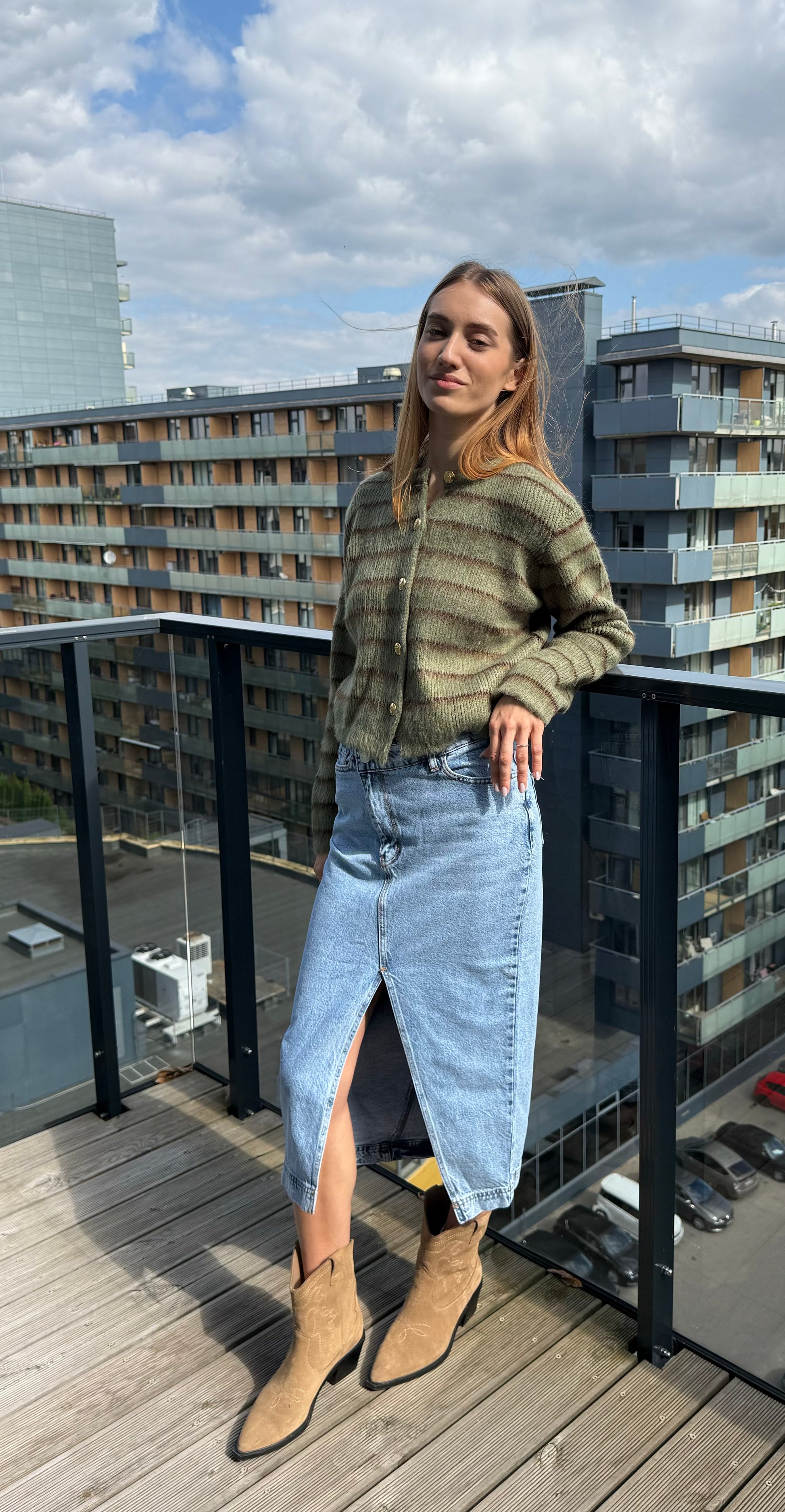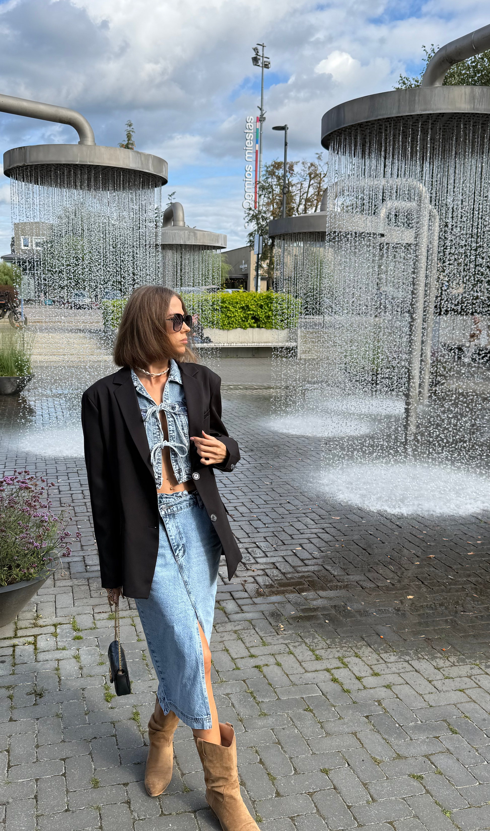 Džinsinis sijonas asimetriškomis siūlėmis priekyje ir gale, bei užsegimu.