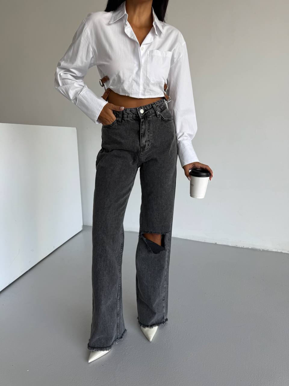 Washed black spalvos džinsai su tiesiu išpjovimu ant kairės kojos kelio. Audinys storesnis, todėl kelnės gražiai krenta ant batų. Džinsai gana ilgi, todėl puikiai tiks ir aukštoms merginoms.
