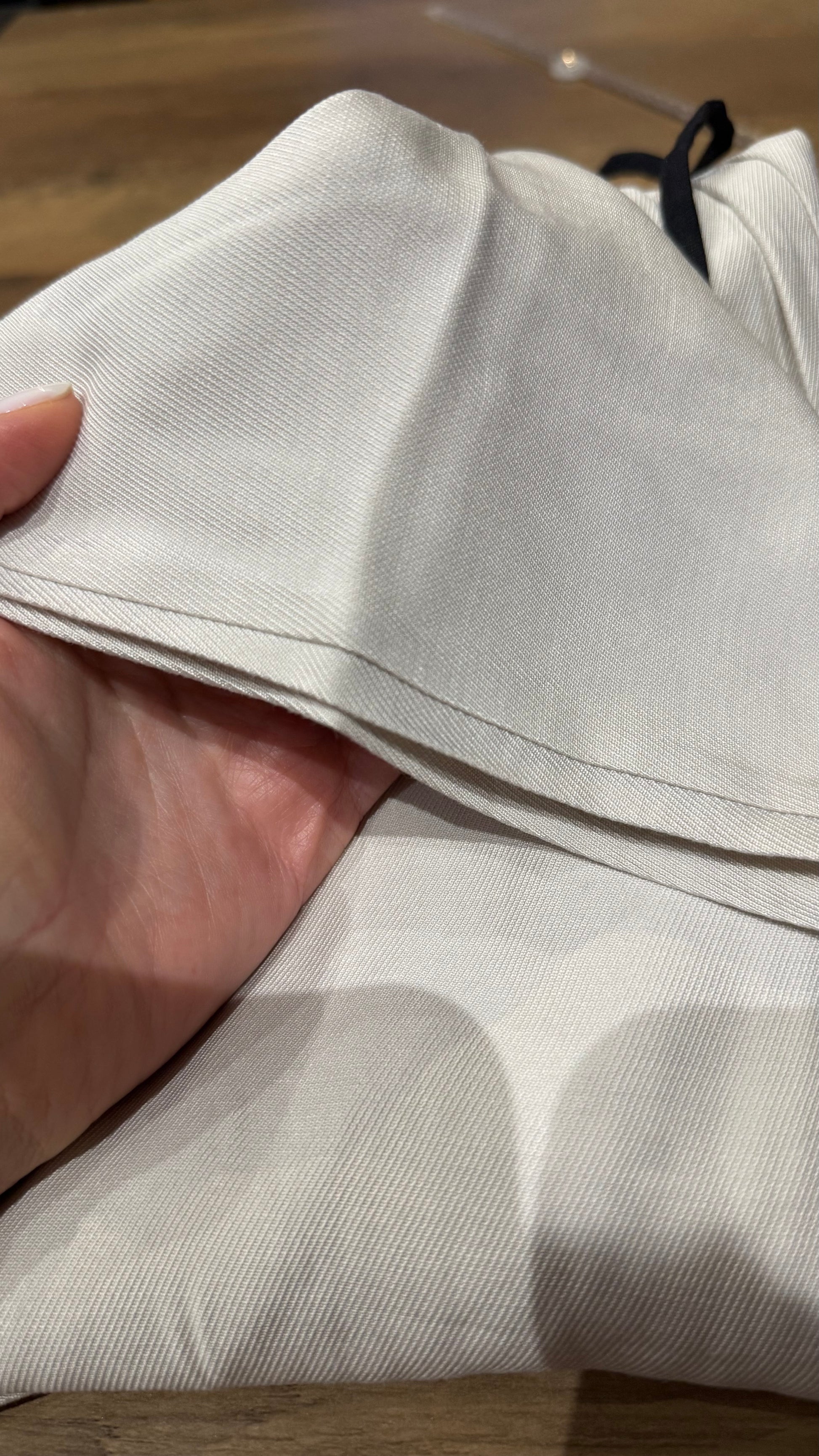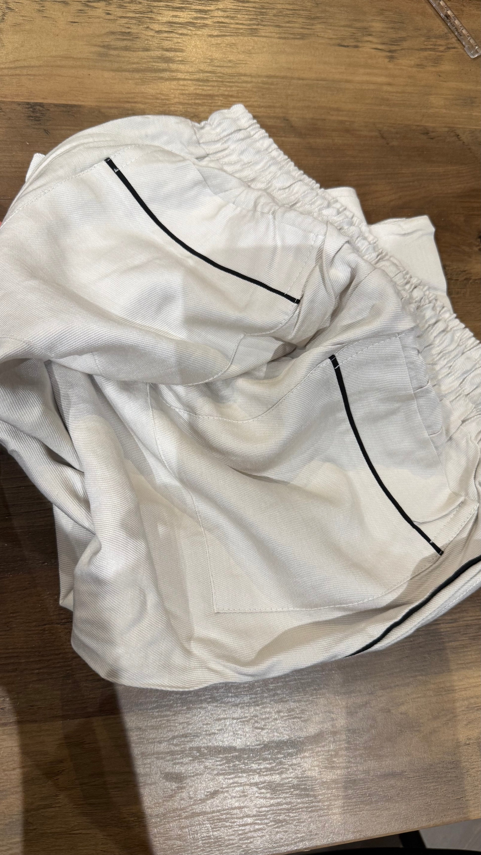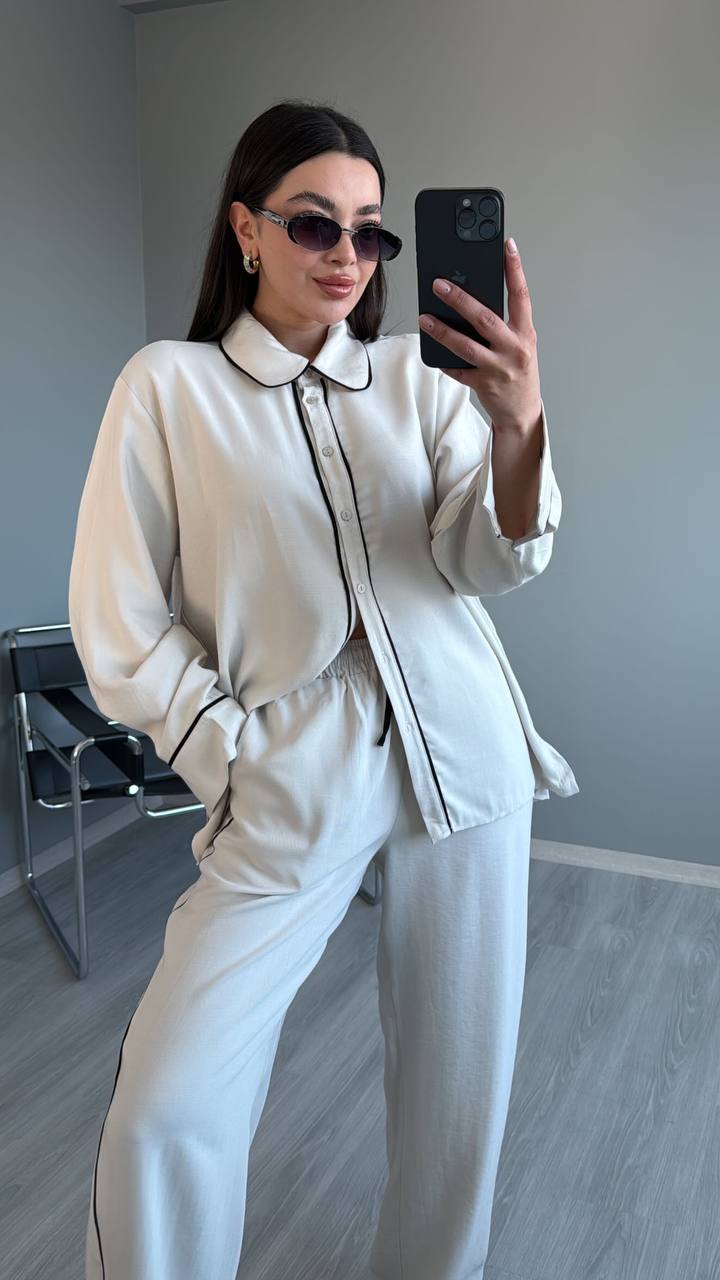 Kelnės ant gumos su raišteliais. Palaidinė su kalnieriumi ir sagutėmis.