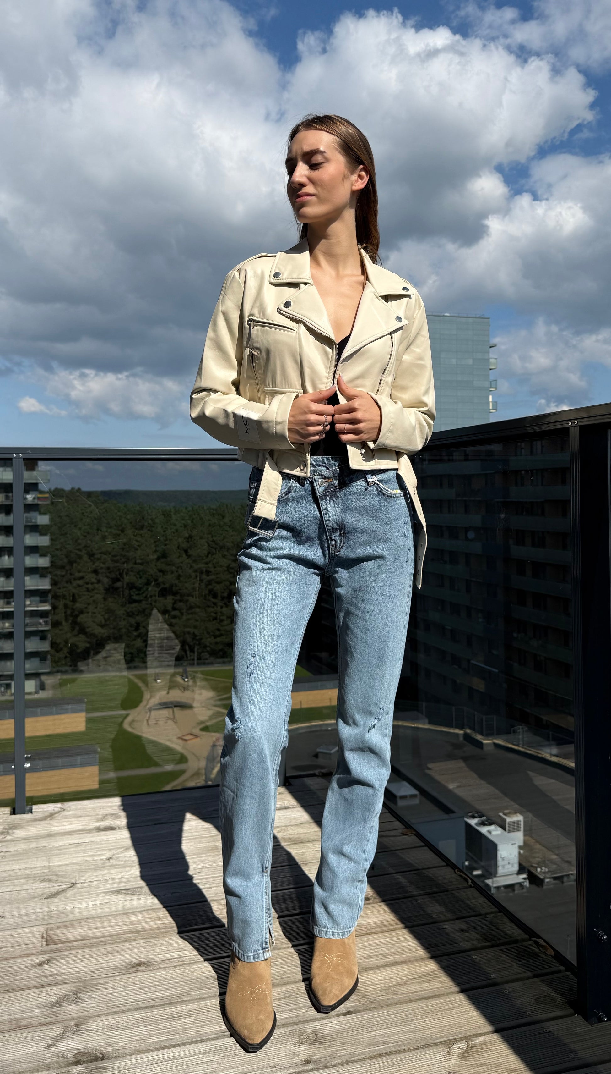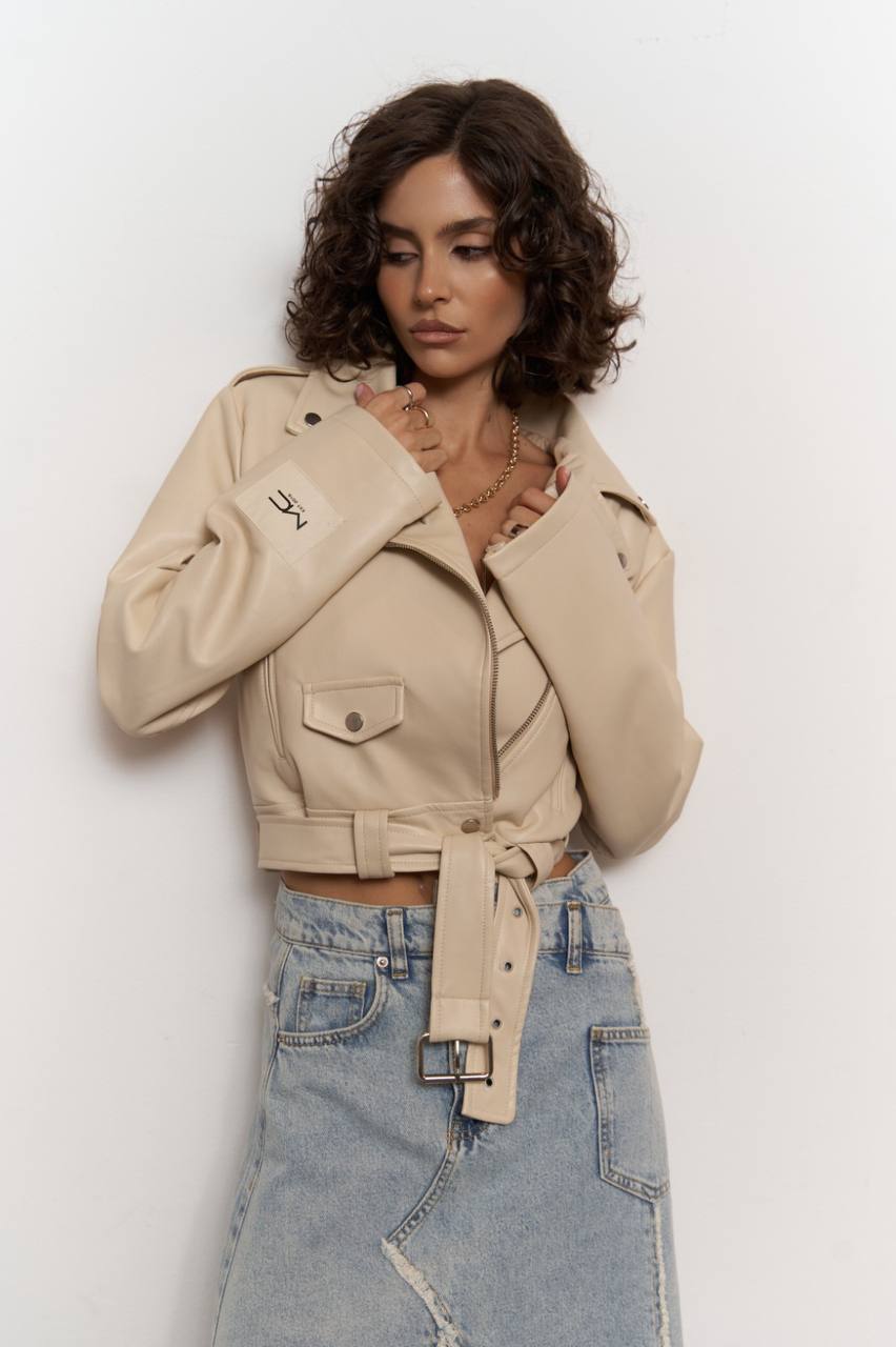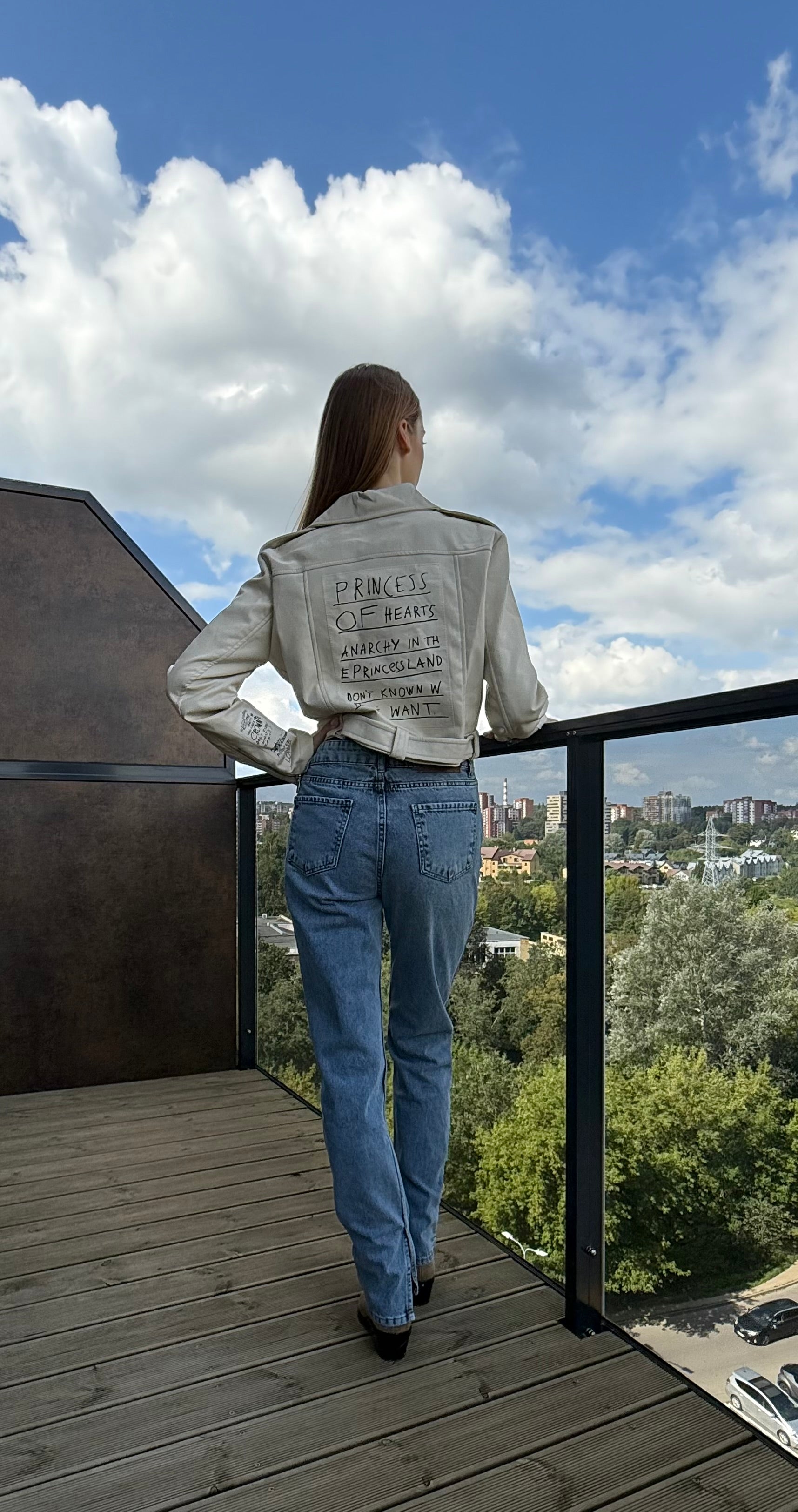 Dirbtinės odos striukytė su aplikacijomis. Iliustracijos medžiaginės, su užrašais.
